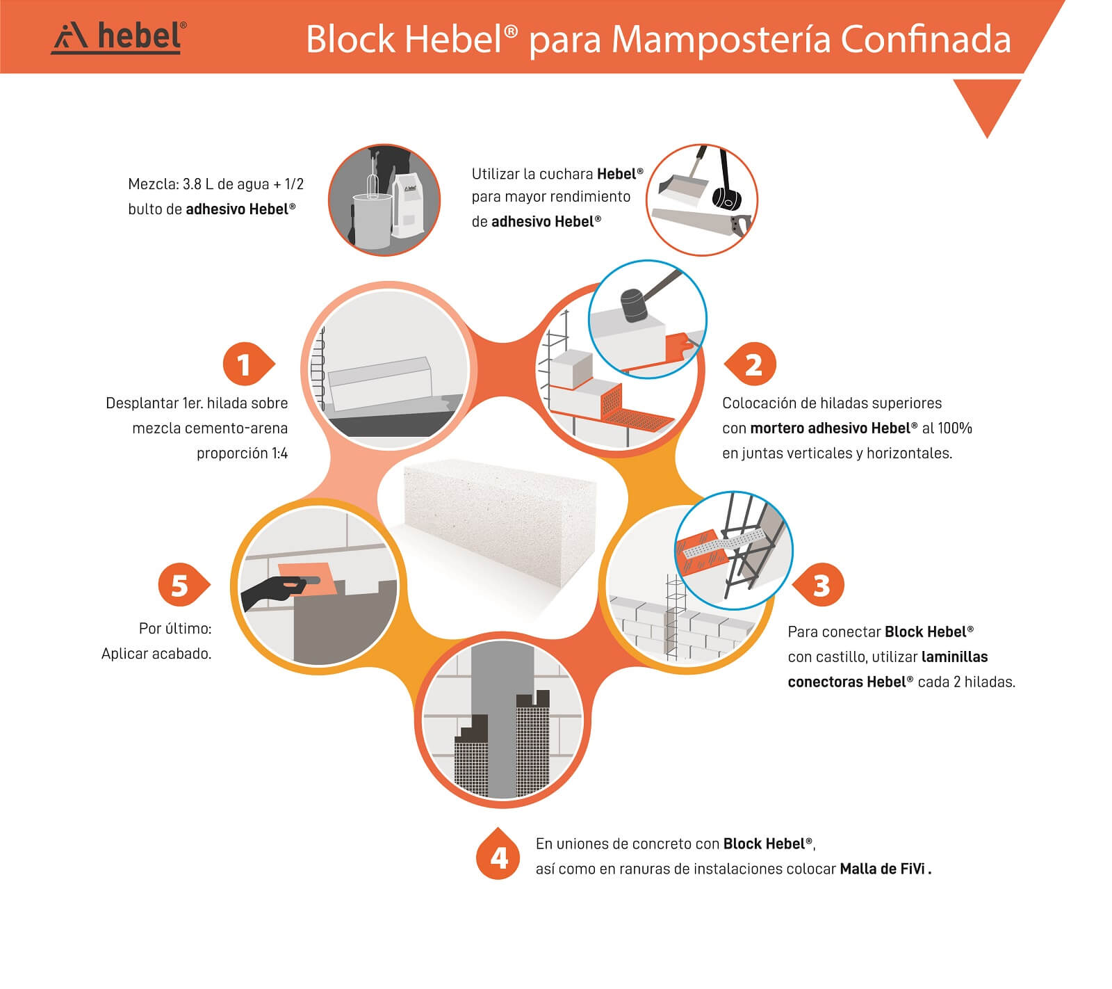 La Mampostería Confinada con Block Hebel® se construye similar al sistema tradicional de albañilería confinada, con la diferencia de que reduce tiempos de construcción, además de ser el block más térmico del mercado.